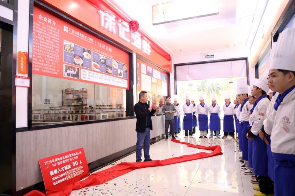 1月7日,广西华南烹饪技工学校在东盟校区举行产教融合教室揭牌及企业宣讲活动,旨在加强校企合作,提升学生就业能力。广西华南烹饪技工学校校长翟维铁、督学王丰尧、东盟校区主任谢全林、创就业中心主任唐毓得、中餐